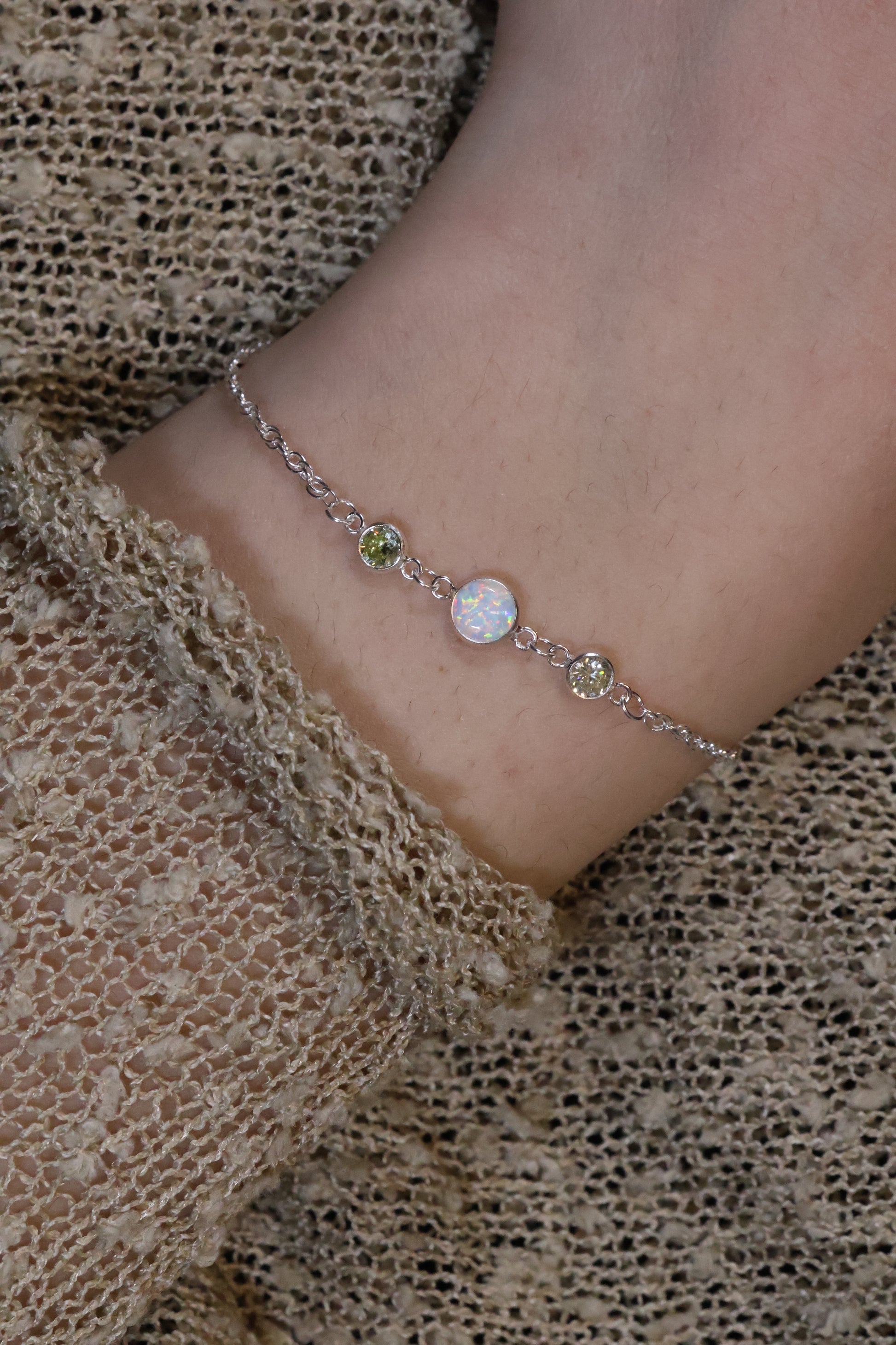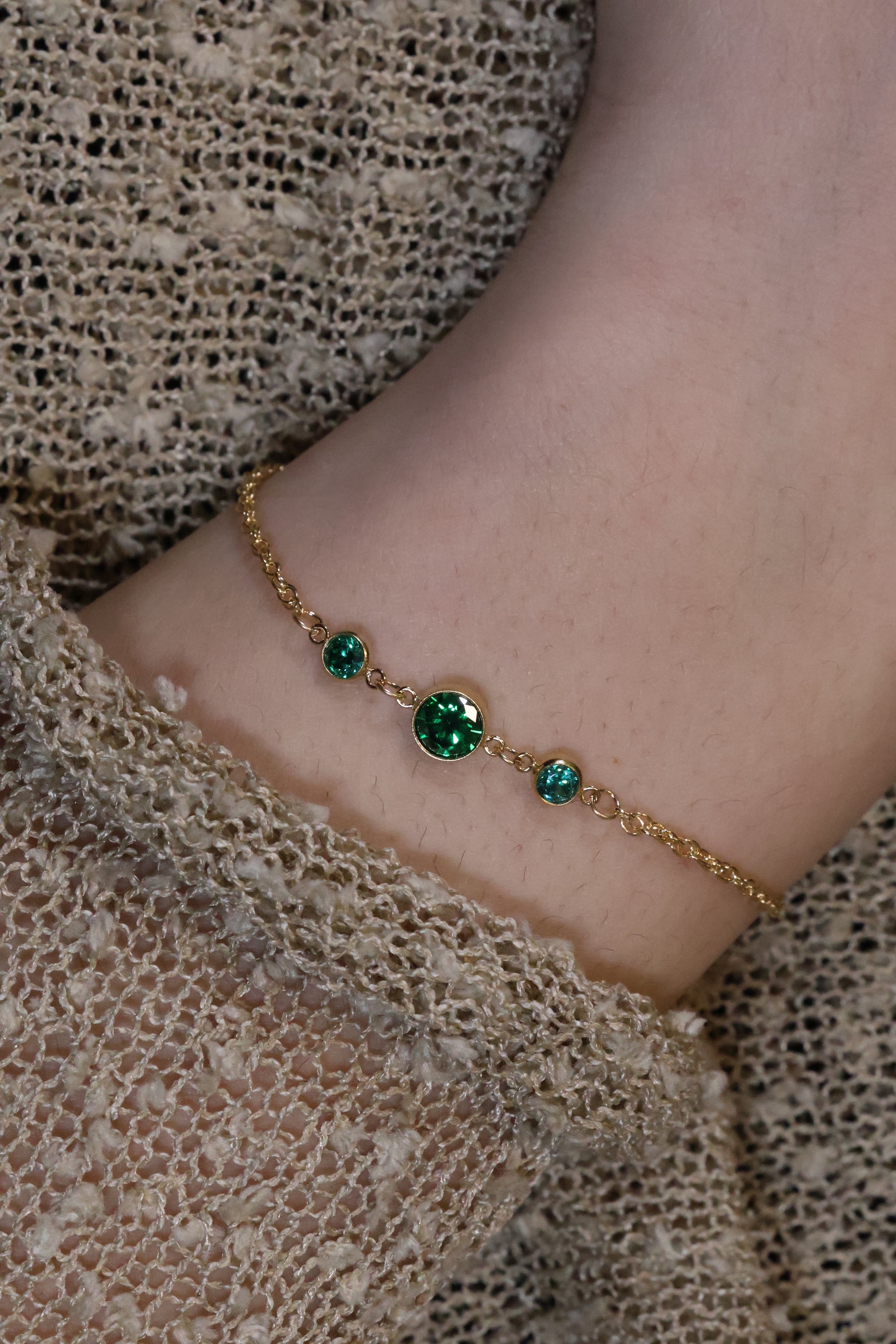 Diese elegante Armkette ist mit drei sorgfältig ausgewählten Monatssteinen veredelt – zwei kleinere Steine flankieren einen größeren in der Mitte.