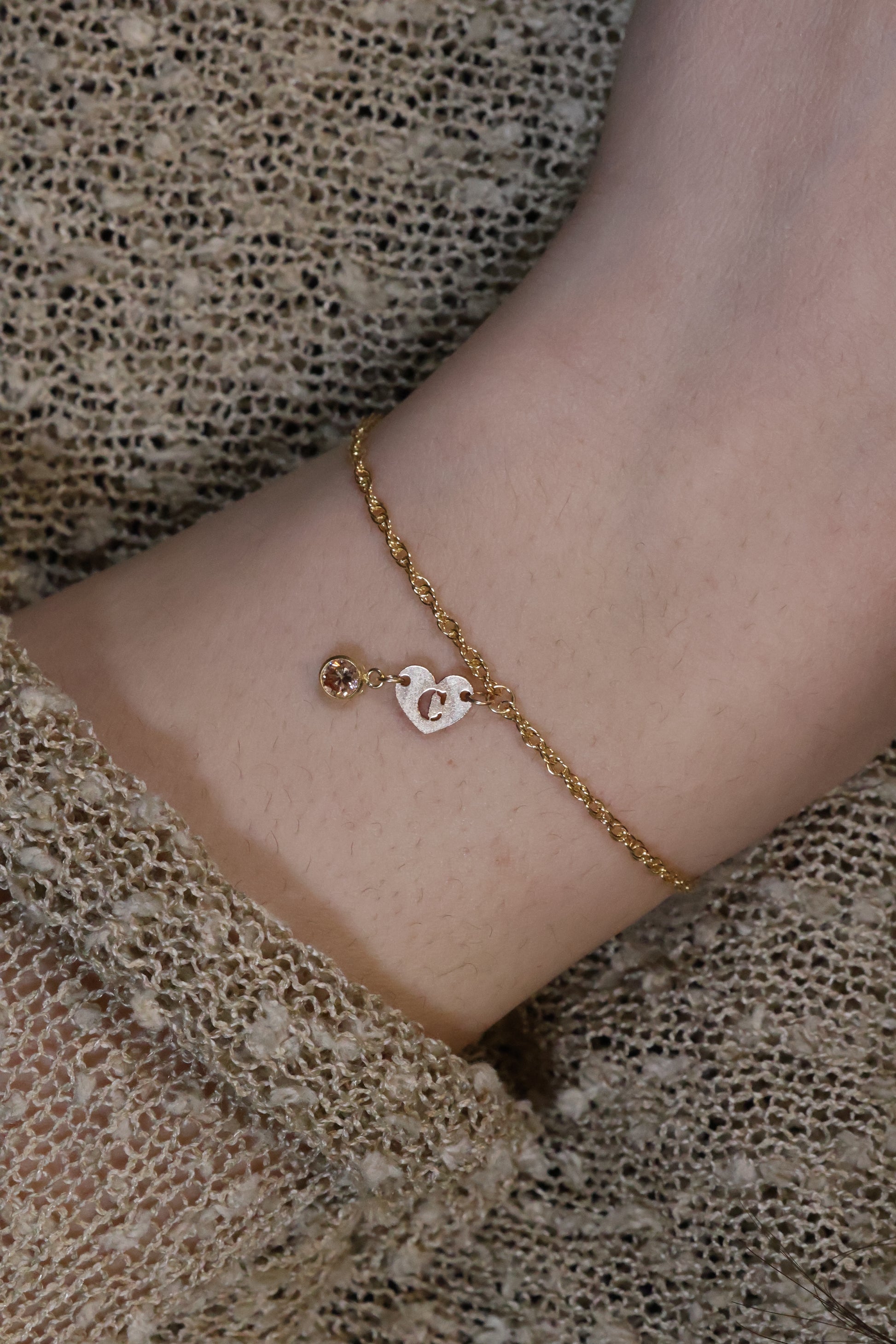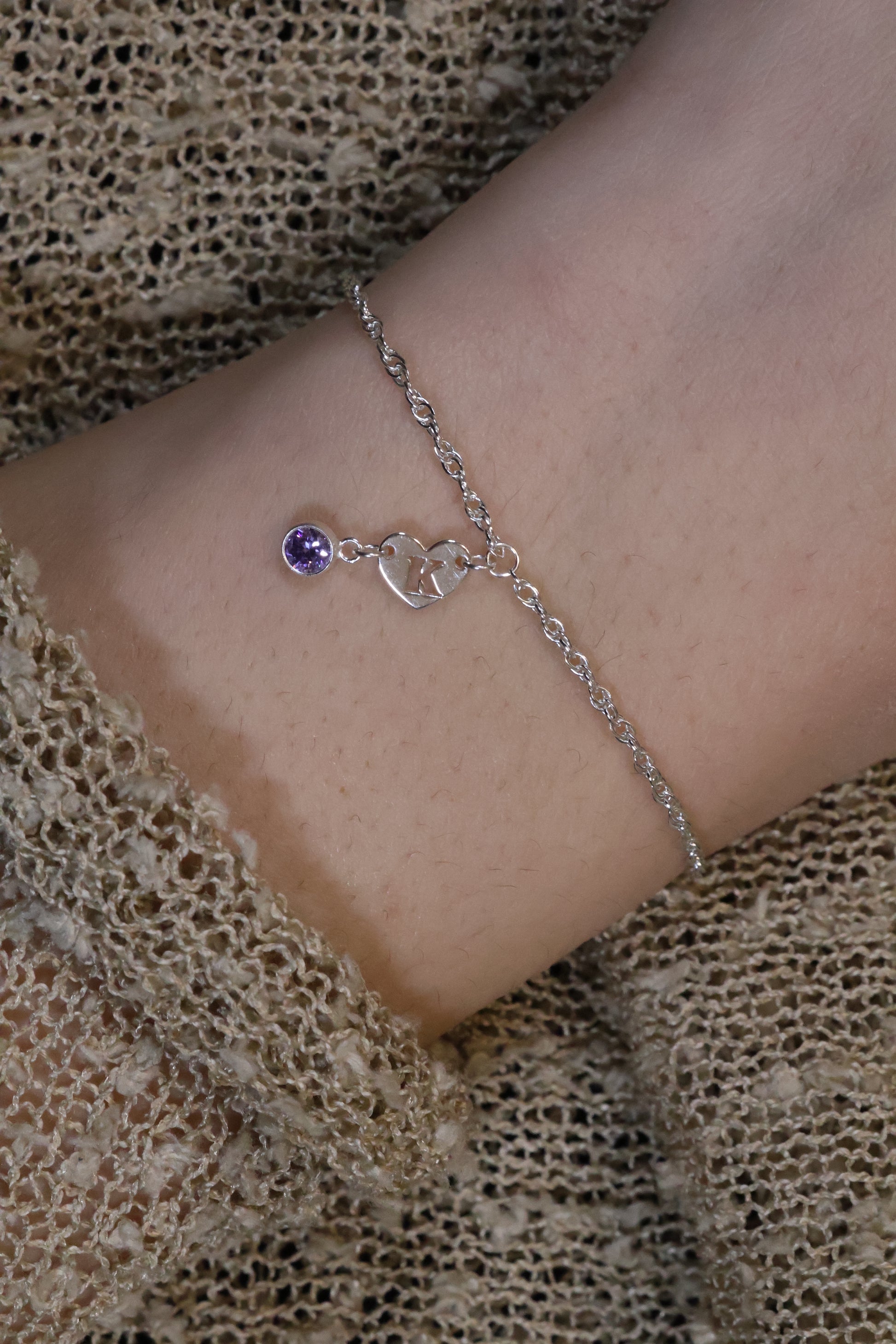Diese zarte Armkette vereint zwei bedeutungsvolle Elemente: ein Herz-Anhänger mit eingestanztem Buchstaben und ein funkelnder Monatsstein.