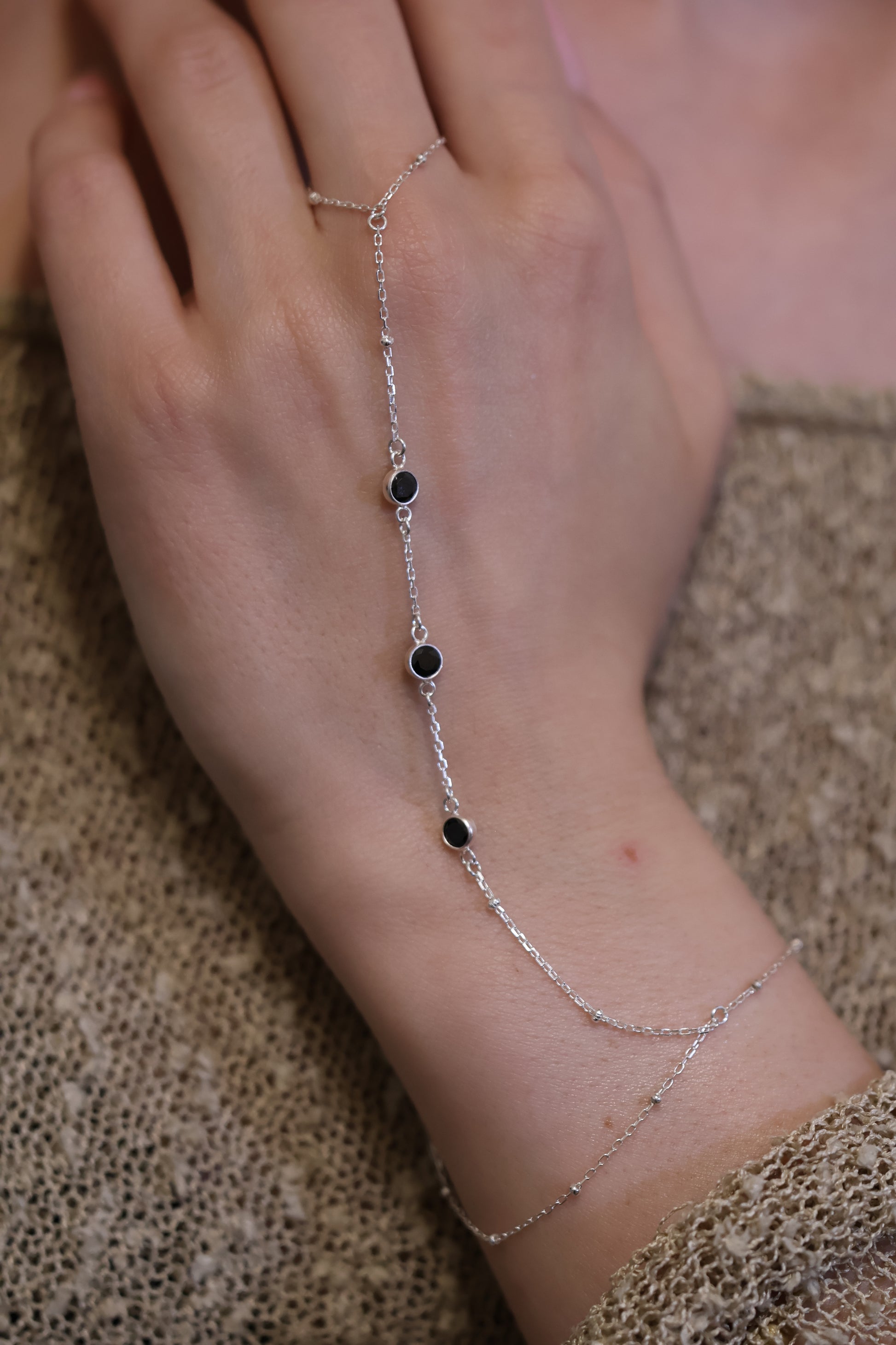 Der filigrane Verbinder mit drei funkelnden Monatssteinen verleiht der Hand Chain eine ganz persönliche Bedeutung – jeder Stein kann für einen Herzensmenschen, einen besonderen Monat oder einen wichtigen Moment in deinem Leben stehen.