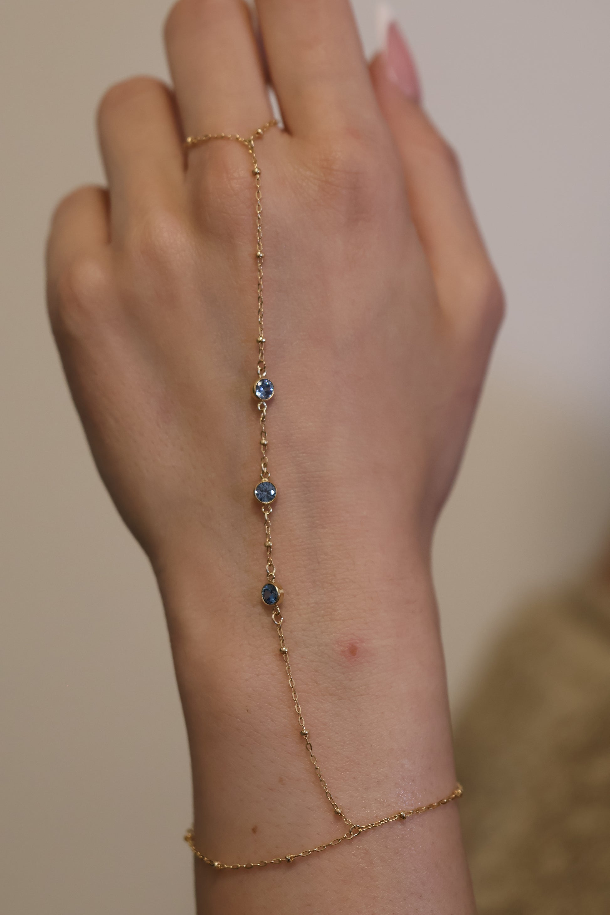 Der filigrane Verbinder mit drei funkelnden Monatssteinen verleiht der Hand Chain eine ganz persönliche Bedeutung – jeder Stein kann für einen Herzensmenschen, einen besonderen Monat oder einen wichtigen Moment in deinem Leben stehen.